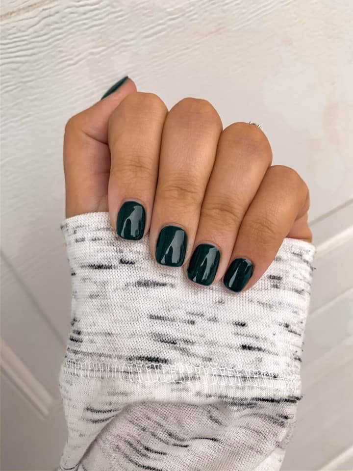 Dark green. Pearl finish. Opaque. Cool undertone.