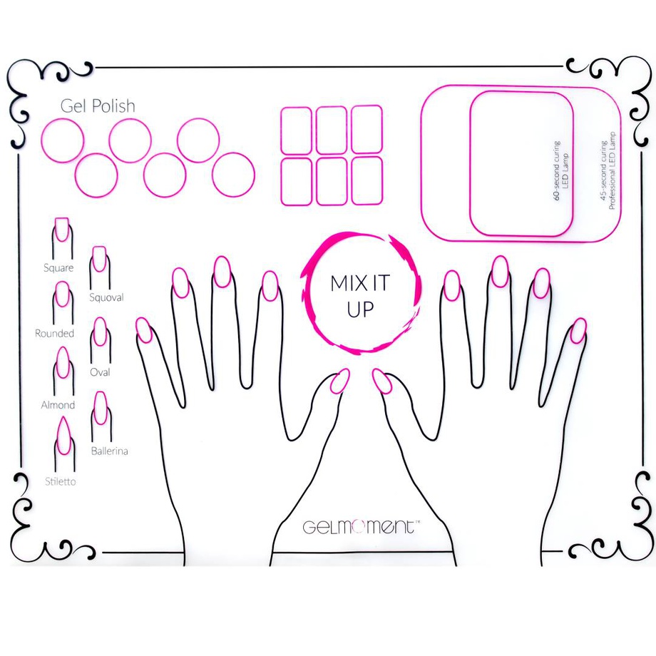 Our new Silicone Mat makes nail art and clean up a breeze! This mat is washable, reusable, and professional! There are sections for practicing your nail art as well as mixing colours and laying out your supplies. Purchase several and use them as place-mats at your parties or events!